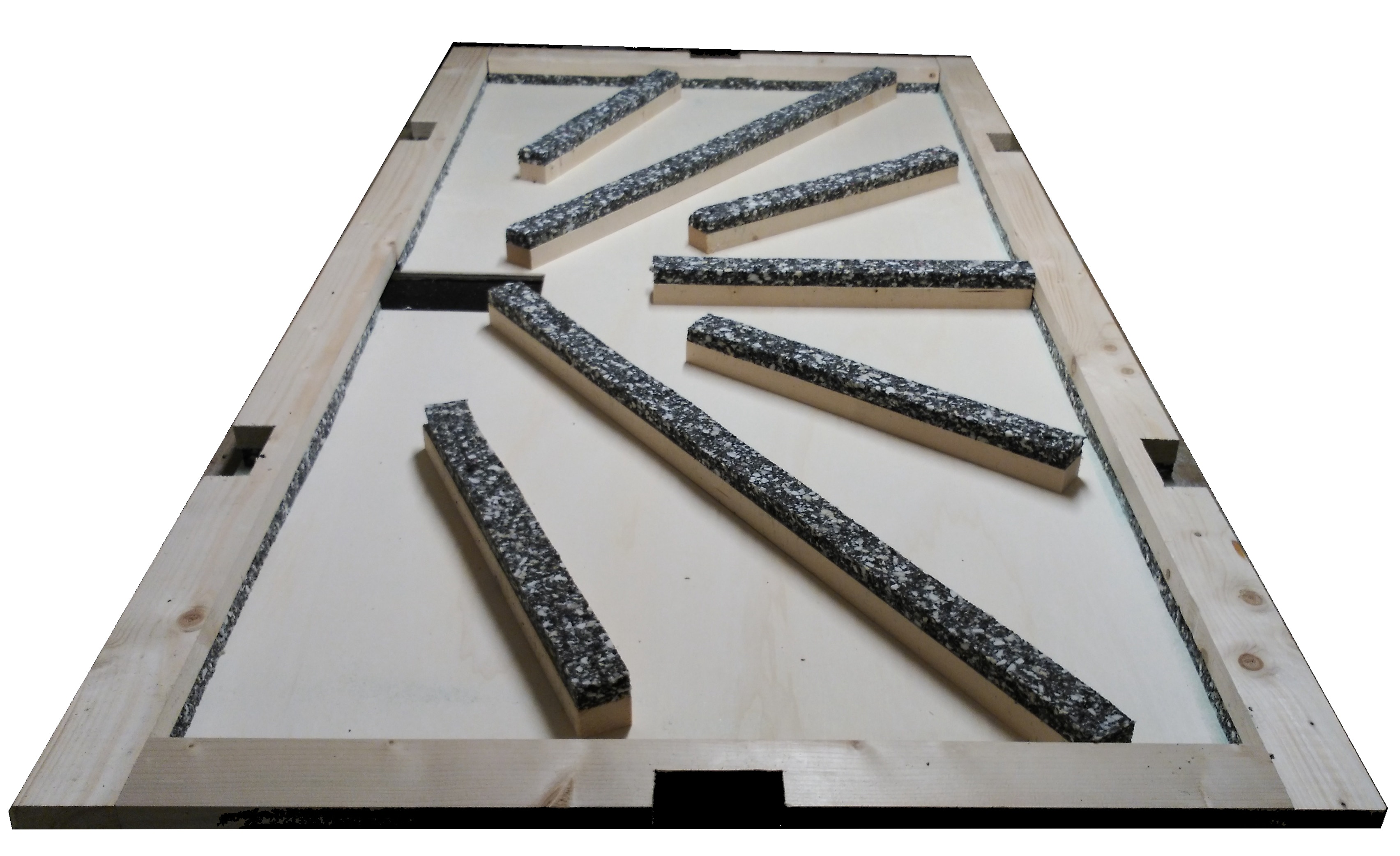 Fabricados con madera de abedul de 18mm que proporcionan una superficie acústica de calidad y una amortiguación que hace menos agresiva la practica de la danza para las articulaciones. Toda la tarima apoya sobre gomas, y su union se realiza mediante su sistema de cierres ya integrados en los módulos. Evitando así el dañar la base donde se monta, ya que no necesita atornillar nada en el soporte. El acabado puede ser pintado con tintes al aceite, al alcohol, o con pintura acrílica en diferentes colores. También podemos acabarlo con Linoleum o con PVC Homogéneo de gran resistencia, el cual nos proporciona una protección de la madera tanto al agua como al astillado de la misma.